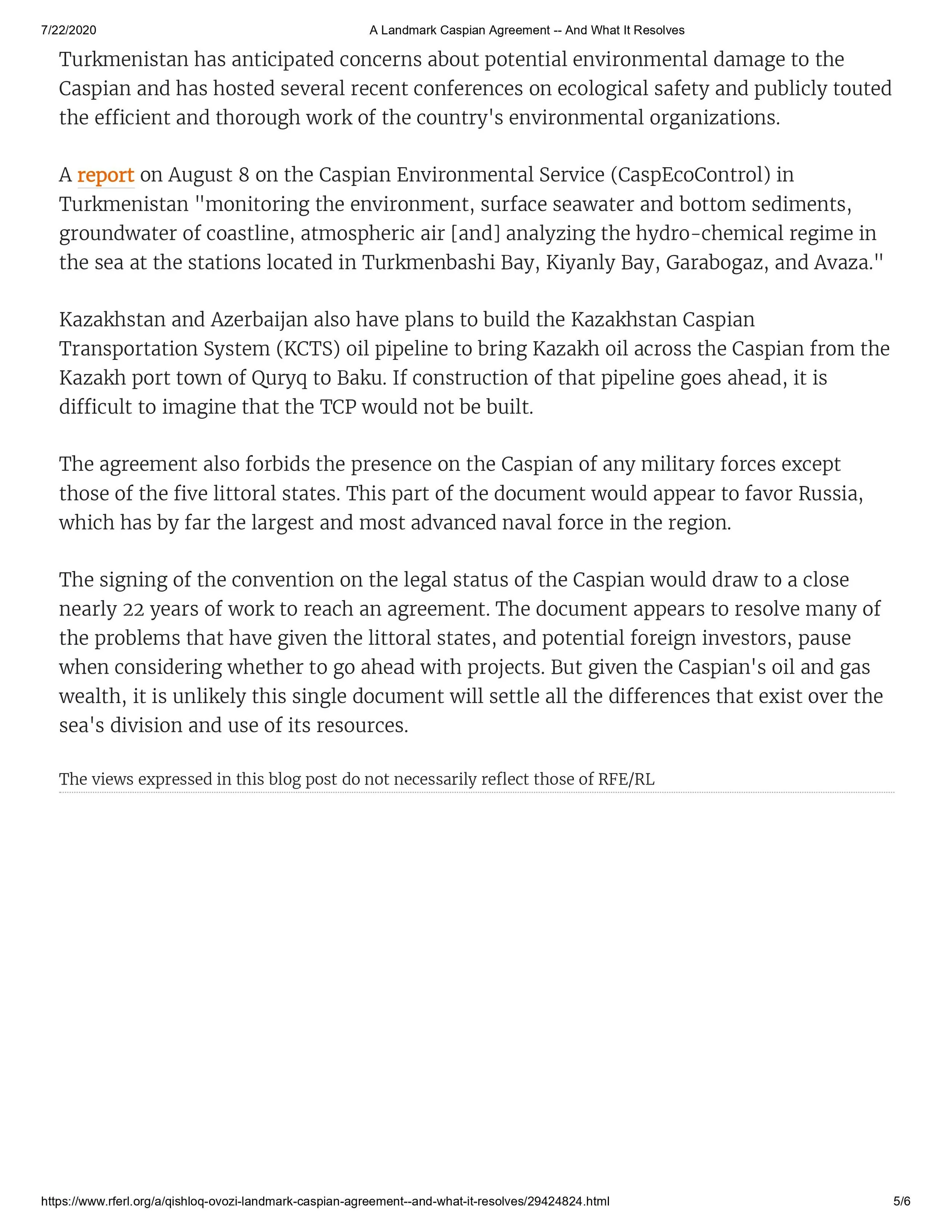 A Landmark Caspian Agreement -- And What It Resolves Jul 22 Written By Bert Watson ‡ https://www.rferl.org/a/qishloq-ovozi-landmark-caspian-agreement--and-what-it-resolves/29424824.html Bert Watson